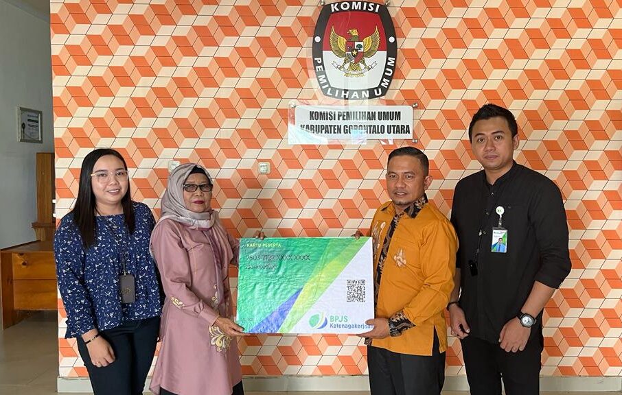 , Gorontalo – Ribuan anggota Badan Ad Hoc Komisi Pemilihan Umum (KPU) Kabupaten Gorontalo dan Gorontalo Utara (Gorut) mendapatkan kabar gembira saat resmi terdaftar di program Jaminan Sosial Ketenagakerjaan (Jamsostek) dari Badan Penyelenggara Jaminan Sosial (BPJS) Ketenagakerjaan Cabang Gorontalo. Total sebanyak 2.167 anggota Badan Ad Hoc KPU Kabupaten Gorontalo dan Gorut menerima kartu kepesertaan BPJS Ketenagakerjaan secara simbolis dari Kepala BPJS Ketenagakerjaan Cabang Gorontalo, Arif Budiman, yang diwakili Kepala Bidang Keuangan Natasha Angelica.