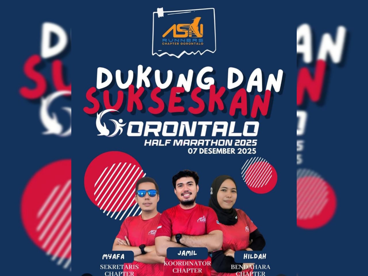 Melalui unggahan di akun Instagram resmi mereka, @asnrunners_gto, komunitas lari yang beranggotakan Aparatur Sipil Negara di Gorontalo itu menyerukan ajakan bersama dengan tema: “Dukung dan Sukseskan Gorontalo Half Marathon 7 Desember 2025.” Unggahan tersebut turut menampilkan Ketua, Sekretaris, dan Bendahara ASN Runners Chapter Gorontalo sebagai bentuk dukungan resmi komunitas.