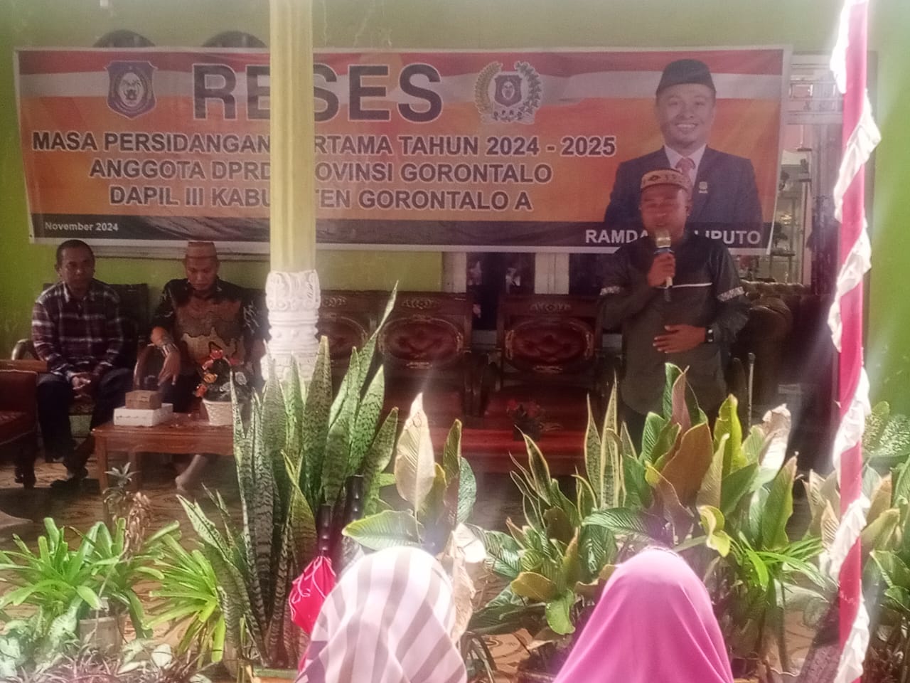 Gorontalo — Anggota DPRD Provinsi Gorontalo, Ramdan Liputo, melaksanakan reses perdananya pada reses masa persidangan 2024-2025 dengan mengunjungi Desa Pentadio Timur pada Rabu, (13/11/2024). Kunjungan ini bertujuan untuk mendengar langsung aspirasi dan keluhan warga terkait berbagai masalah yang dihadapi di daerah tersebut.