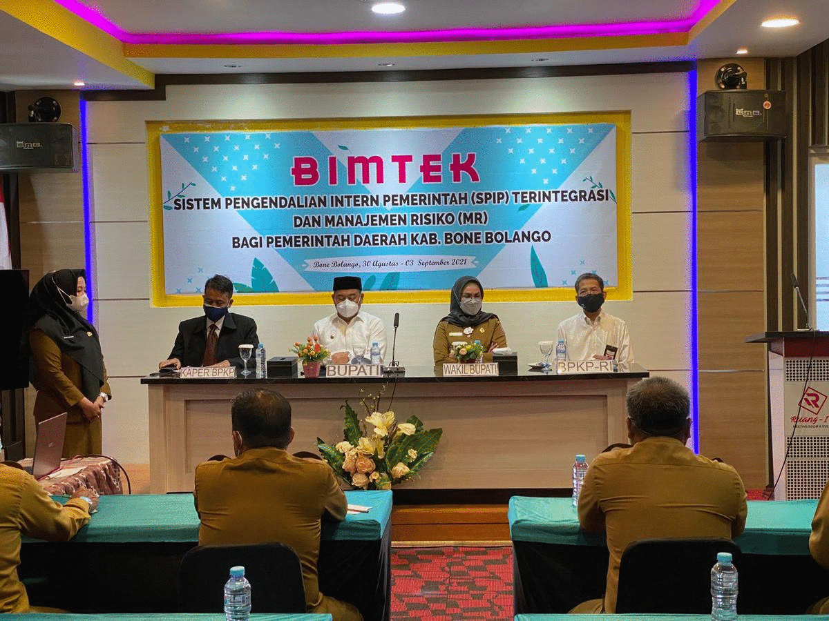 , Bone Bolango – Dalam rangka meningkatkan Pemahaman terhadap Sistem Pengendalian Intern Pemerintah (SPIP) Terintegrasi dan Manajemen Risiko (MR), Pemerintah Kabupaten Bone Bolango menggandeng BPKP Gorontalo mengadakan Bimtek Sistem Pengendalian Intern Pemerintah (SPIP) Terintegrasi dan Manajemen Risiko (MR) Bagi Pemerintah Daerah Kabupaten Bone Bolango.