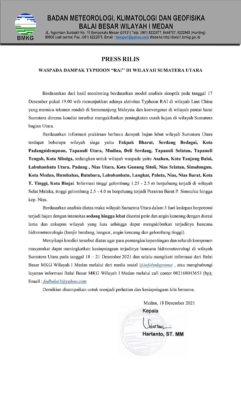 – Berdasarkan hasil monitoring model analisis sinoptik yang dilakukan Badan Meteorologi, Klimatologi dan Geofisika (BMKG) Balai Besar Wilayah I Medan pada tanggal 17 Desember 2021 menunjukkan adanya aktivitas Typhoon RAI di laut Cina.