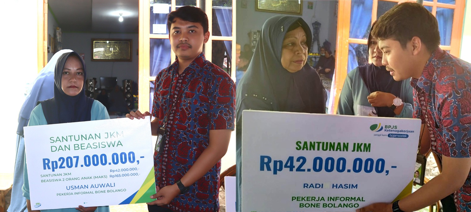 , Bone Bolango – Badan Penyelenggara Jaminan Sosial (BPJS) Ketenagakerjaan atau BPJamsostek Cabang Gorontalo memberikan bantuan santunan Jaminan Kematian (JKM) dan manfaat beasiswa kepada ahli waris nelayan di Kabila Bone. Santunan JKM senilai Rp42 juta diberikan kepada ahli waris almarhum Radi Hasim, sedangkan santunan JKM dan manfaat beasiswa senilai Rp207 juta diserahkan kepada ahli waris almarhum Usman Auwali. Total bantuan santunan dan beasiswa yang diserahkan mencapai Rp249 juta.