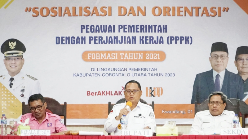 , Gorontalo Utara – Sejumlah Pegawai Pemerintah dengan Perjanjian Kerja (PPPK) tenaga pendidik dan kesehatan formasi tahun 2021 di lingkungan Pemerintah Kabupaten (pemkab) Gorontalo Utara, mengikuti sosialisasi dan orientasi yang berlangsung di Aula Gerbang Emas Kantor Bupati Gorontalo Utara, Rabu (01/02/2023).