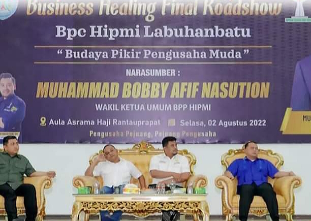 DAILYPOST.ID , Labuhanbatu – BUPATI Labuhanbatu Erik Adtrada Ritonga mendampingi Wakil Ketua Umum BPP Hipmi Muhammad Bobby Afif Nasution pada kegiatan business healing final roadshow BPC Hipmi Kabupaten Labuhanbatu di aula asrama haji Rantauprapat, Selasa (2/7/2022).