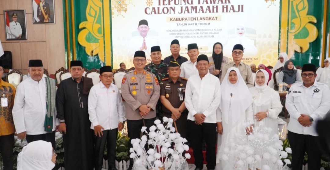 , Langkat – Bupati Langkat H. Syah Afandin, SH bersama Wakil Bupati Langkat Tiorita Br Surbakti, SH menepungtawari sekaligus memberikan doa restu kepada 398 Jamaah Calon Haji (JCH) asal Kabupaten Langkat Tahun 2026 M/1447 H. Prosesi berlangsung khidmat di Pendopo Jentera Malay, Rumah Dinas Bupati Langkat, Stabat, Jumat (15/4/2026), dengan dihadiri unsur Forkopimda dan para tamu undangan.