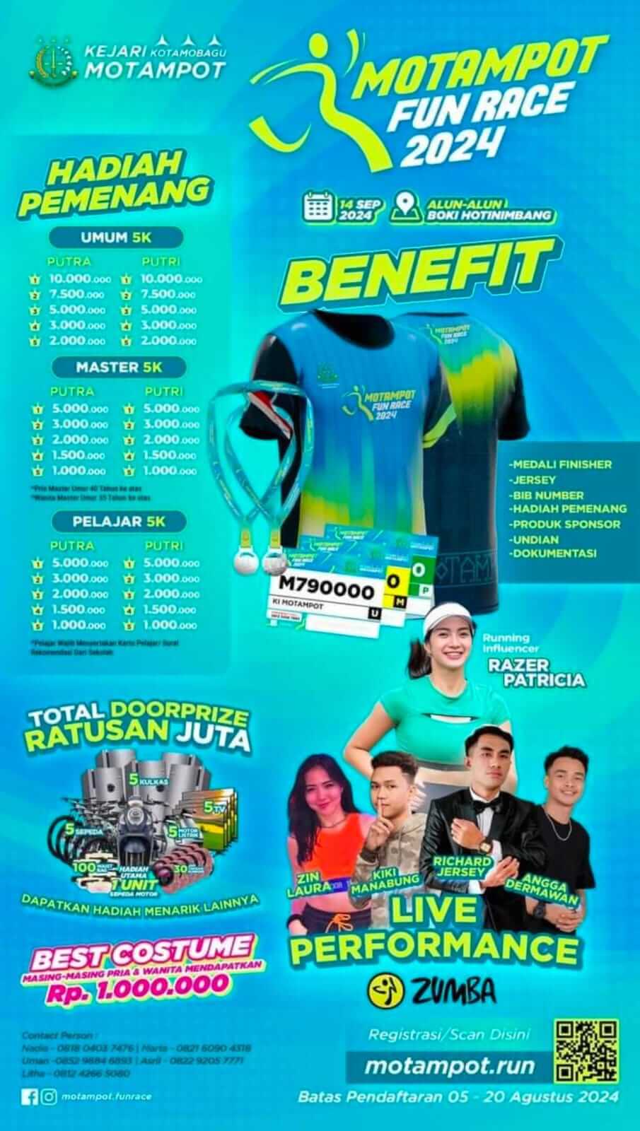 Bagi masyarakat yang tertarik untuk mengikuti Motampot Fun Race, jangan tunda lagi! Pendaftaran akan ditutup pada 20 Agustus, jadi pastikan untuk segera mendaftar agar tidak kehabisan slot. Informasi lebih lanjut mengenai pendaftaran dapat menghubungi panitia penyelenggara.