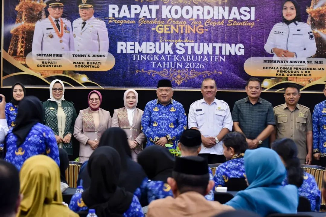 Kabgor – Pemerintah Kabupaten Gorontalo menggelar Rapat Koordinasi Program Gerakan Orang Tua Cegah Stunting (GENTING) yang dirangkaikan dengan Rembuk Stunting Tahun 2026, Senin (20/04/2026), di Ballroom Grand Q Hotel Gorontalo.