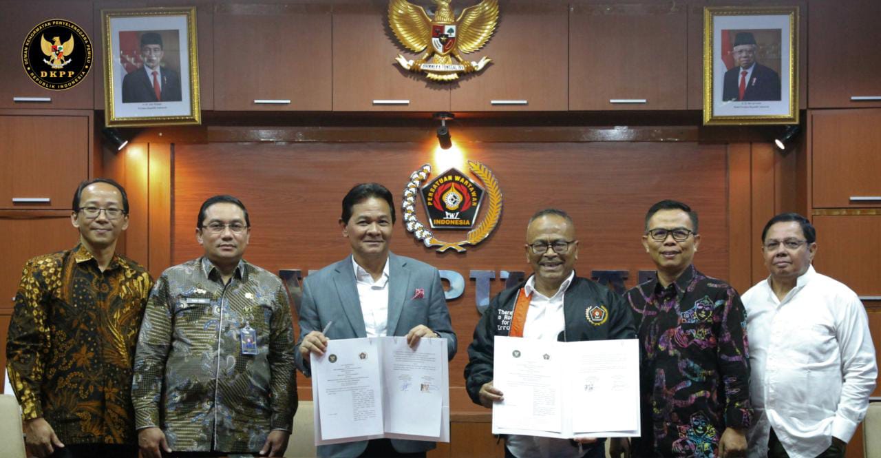 , JAKARTA – Dewan Kehormatan Penyelenggara Pemilu (DKPP) bersama Persatuan Wartawan Indonesia (PWI) menandatangani nota kesepahaman atau memorandum of understanding (MoU) di Kantor PWI, Jakarta, Kamis (6/4/2023).