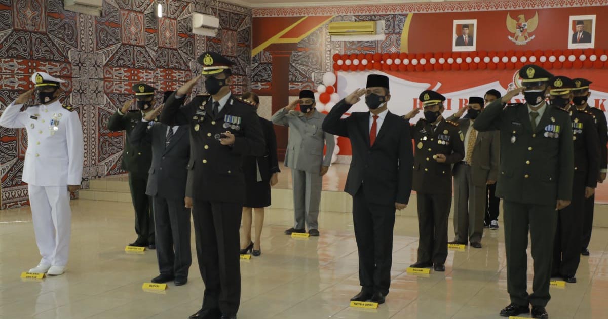 , Asahan – Forkopimda Kabupaten Asahan bersama beberapa tamu undangan mengikuti upacara Hari Ulang Tahun (HUT) Bayangkara ke-75 yang digelar secara virtual di aula Wira Satya Polres Asahan, Kamis (1/7/2021).