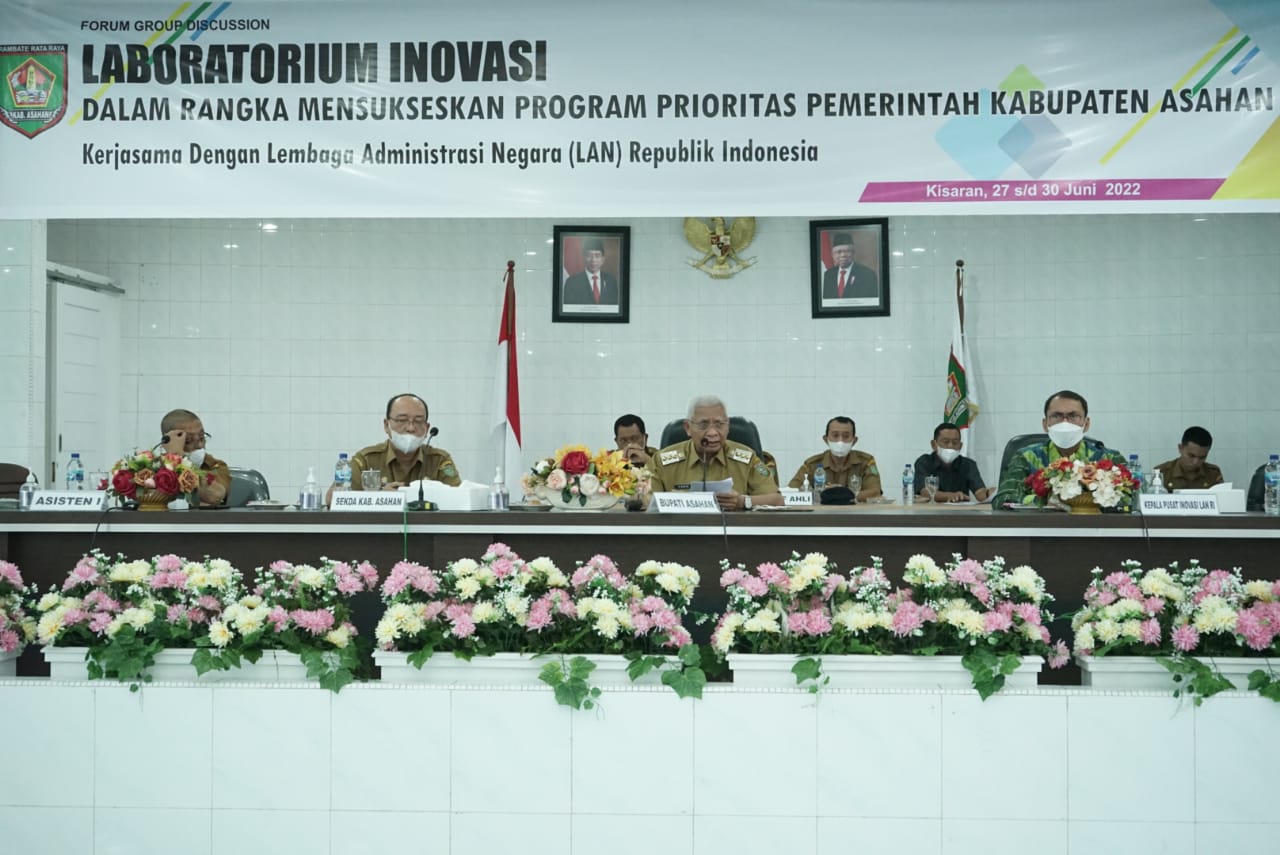 , Asahan – DALAM rangka mensukseskan program prioritas, Pemerintah Kabupaten (Pemkab) Asahan bekerjasama dengan Lembaga Administrasi Negara Republik Indonesia (LAN RI) menggelar Forum Group Discussion (FGD) Laboratorium Inovasi di aula Melati, kantor Bupati Asahan, Senin (27/6/2022)