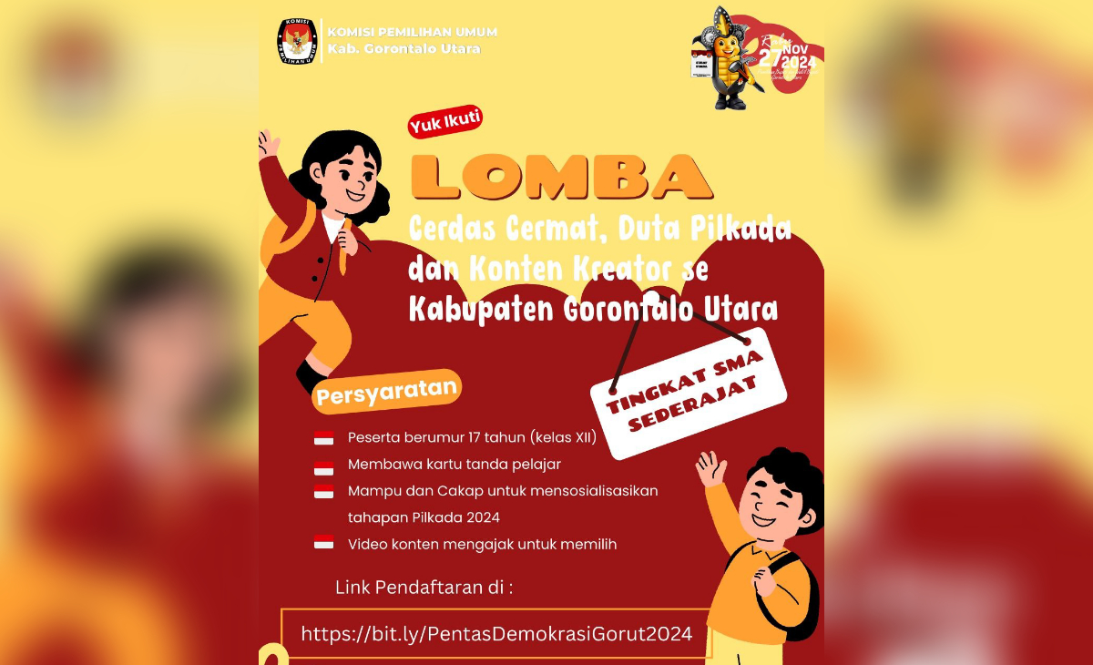 Gorontalo Utara — KPU Kabupaten Gorontalo Utara menggelar ajang yang dinanti-nanti bagi pelajar kelas XII se-Kabupaten Gorontalo Utara. Lomba cerdas cermat, pemilihan Duta Pilkada, dan konten kreator 2024 ini hadir untuk meningkatkan partisipasi generasi muda dalam Pilkada 2024. Dengan tema Pentas Demokrasi Gorontalo Utara, kompetisi ini bertujuan mendorong kreativitas, pengetahuan, dan peran aktif para pelajar dalam mensosialisasikan tahapan Pilkada 2024.
