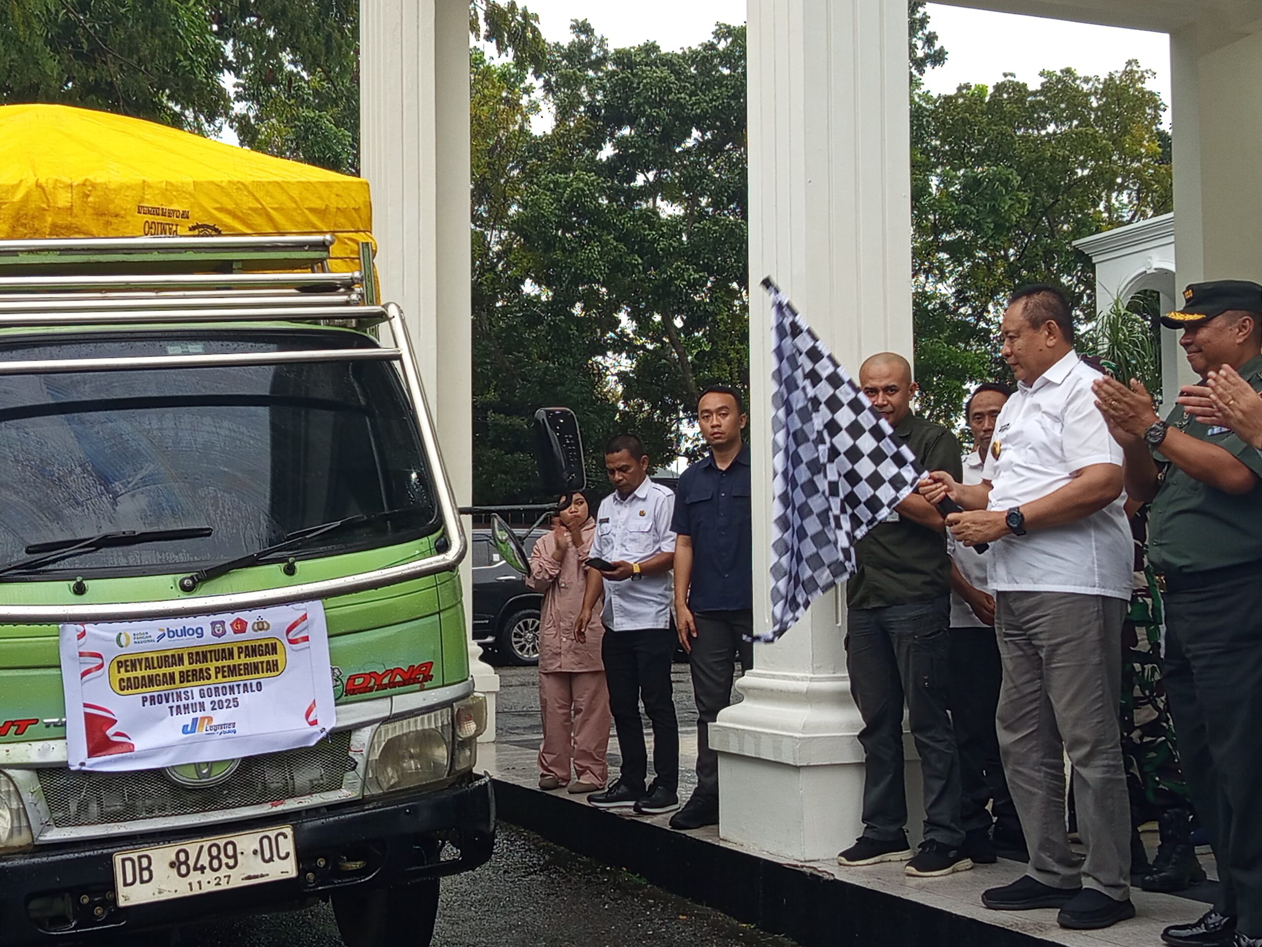 Gorontalo – Gubernur Gorontalo, Gusnar Ismail, secara resmi melepas distribusi bantuan pangan berupa beras pemerintah sebanyak 2.325,52 ton di halaman rumah jabatan Gubernur, Rabu (16/07/2025). Bantuan tersebut disalurkan kepada 116.276 keluarga penerima manfaat (KPM) yang tersebar di seluruh kabupaten/kota di Provinsi Gorontalo.