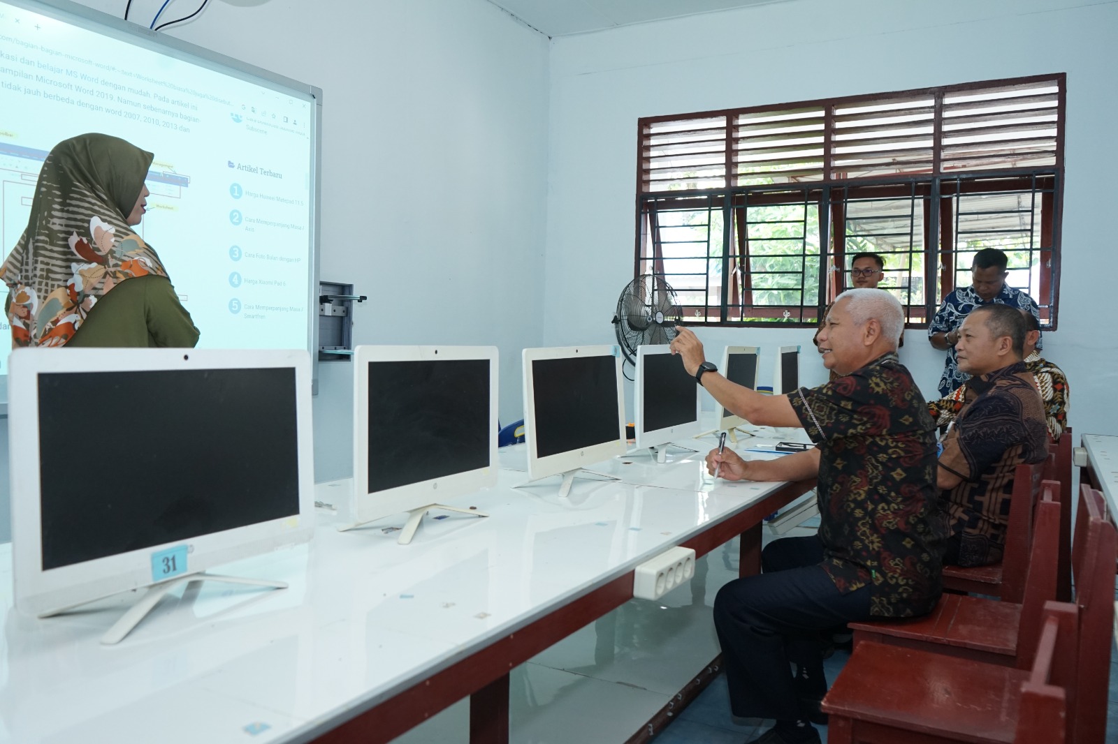 , Asahan – Bupati Asahan Surya meninjau papan tulis interaktif yang ada di ruang TIK SMPN 1 Kisaran, Jumat (1/9/2023).