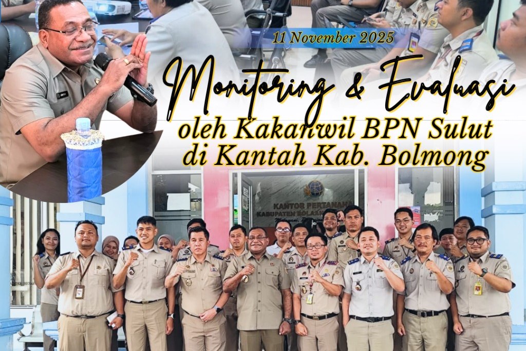 ,BOLAANG MONGONDOW — Kepala Kantor Wilayah Badan Pertanahan Nasional (BPN) Provinsi Sulawesi Utara, John Wiclif Aufa, A.Ptnh, bersama jajaran pejabat administrator, melakukan monitoring dan evaluasi (Monev) di Kantor Pertanahan (Kantah) Kabupaten Bolaang Mongondow, Selasa (11/11/2025).