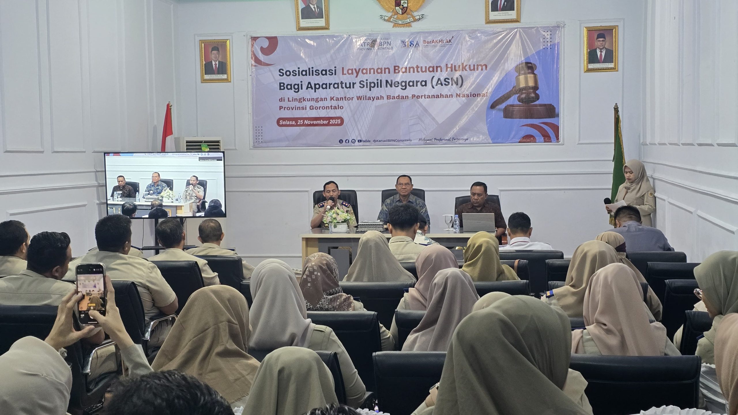 Gorontalo — Kantor Wilayah BPN Provinsi Gorontalo menyelenggarakan Sosialisasi Layanan Bantuan Hukum bagi Aparatur Sipil Negara (ASN) pada Selasa (25/11/2025), bertempat di Aula Kanwil BPN Provinsi Gorontalo. Kegiatan ini menjadi langkah strategis dalam memperkuat pemahaman hukum serta memberikan dukungan advokasi bagi ASN yang bertugas dalam urusan pertanahan. Sosialisasi dibuka langsung oleh Plh. Kepala Kantor Wilayah BPN Provinsi Gorontalo, Ali Rosidi, S.IP., M.T., CRMO, dan dihadiri oleh pejabat fungsional madya, fungsional muda, pejabat administrator, serta seluruh pegawai di lingkungan Kanwil BPN Gorontalo.