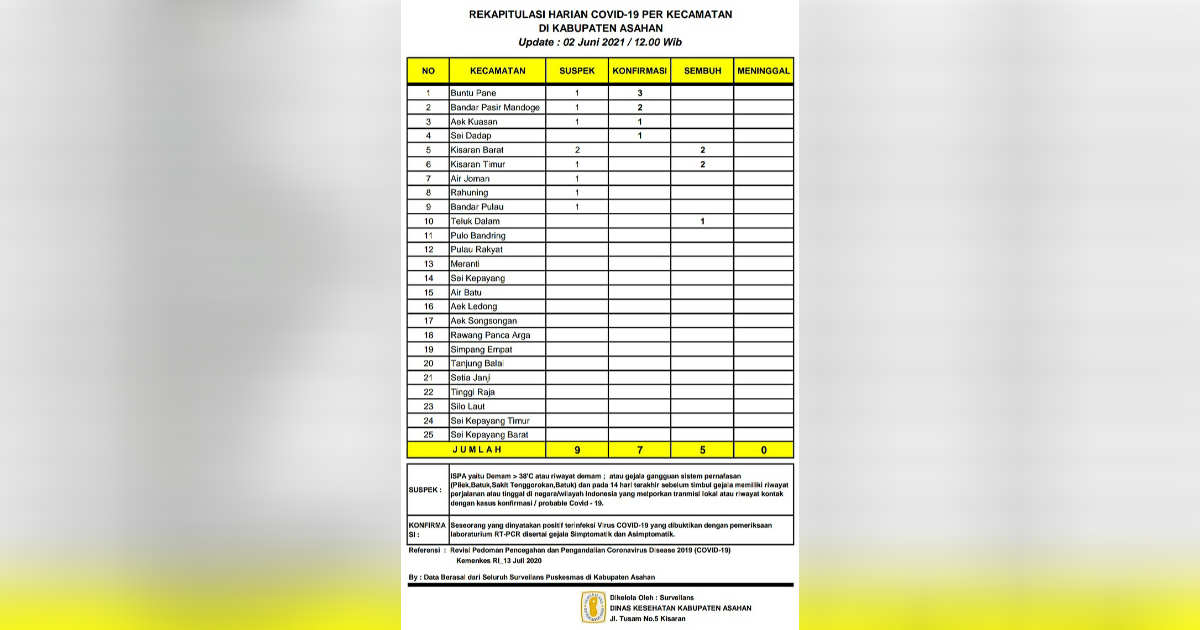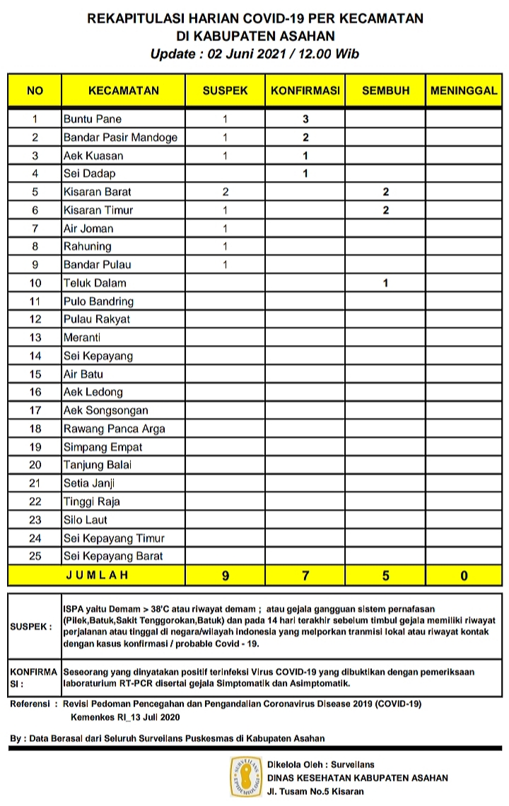 , Asahan – Melalui data per kecamatan yang direkap oleh Dinas Kesehatan Kabupaten Asahan, tercatat kasus Covid-19 selalu mengalami perubahan, baik terkonfirmasi, suspek, dirawat, sembuh bahkan meninggal dunia.