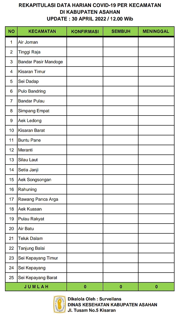 Dari data tabel tersebut, tercatat 25 kecamatan se-Kabupaten Asahan tidak ditemukan terkonfirmasi, sembuh, dan meninggal akibat wabah Covid-19.