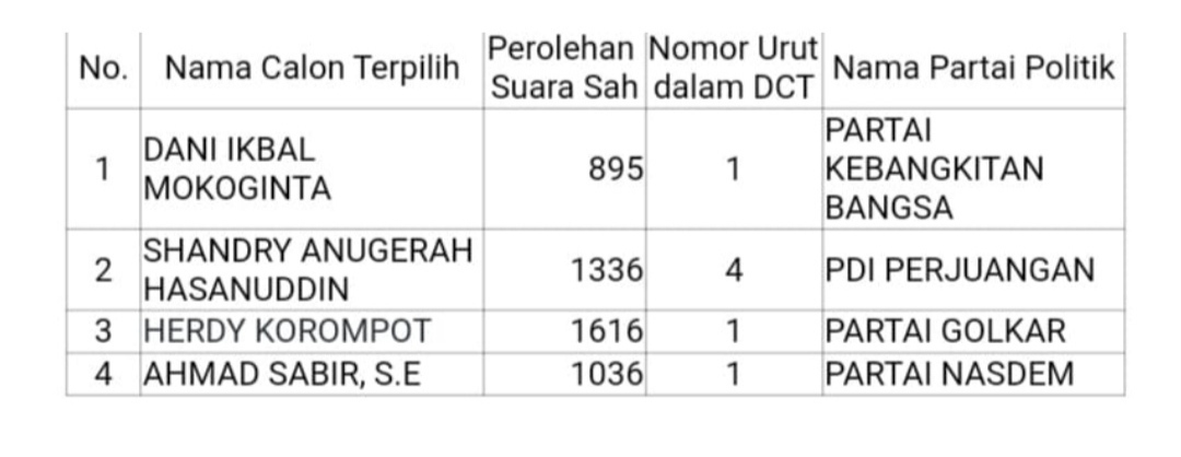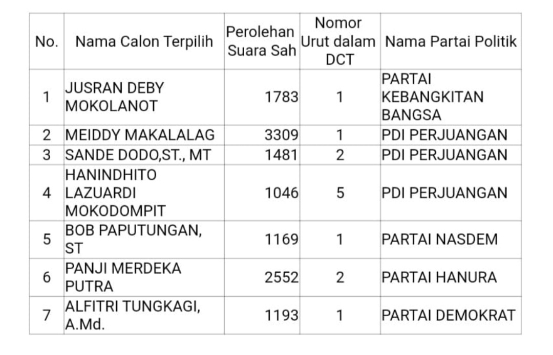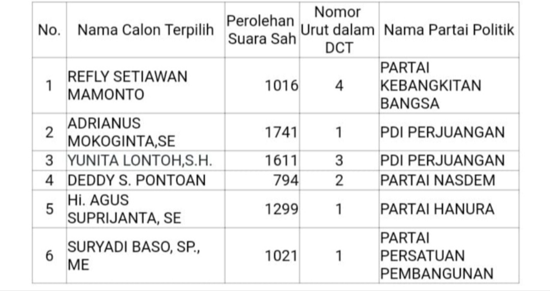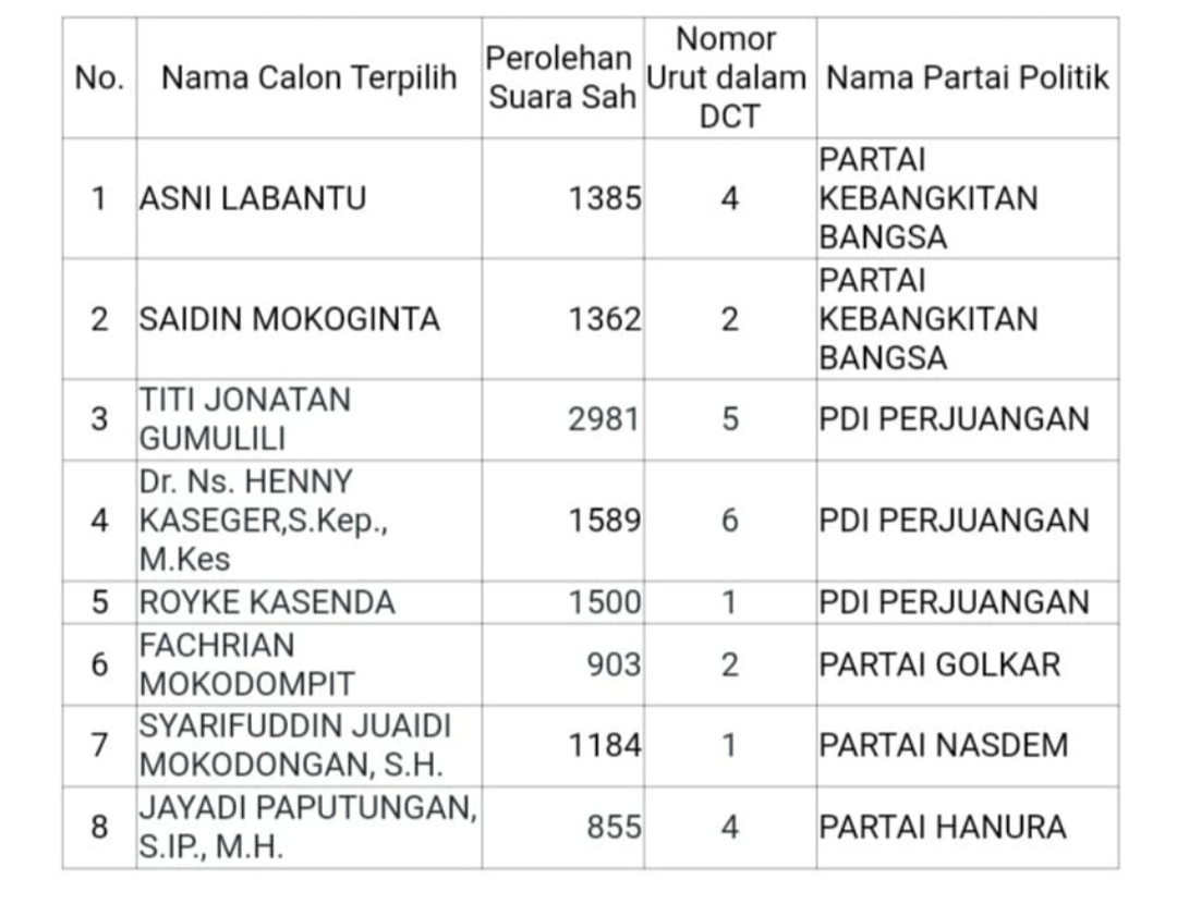 Berikut adalah daftar calon terpilih anggota DPRD Kota Kotamobagu untuk periode mendatang: