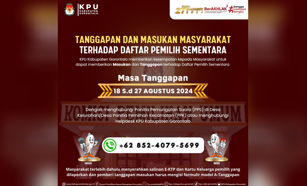 Gorontalo – Komisi Pemilihan Umum (KPU) Kabupaten Gorontalo mengajak masyarakat untuk berperan aktif dalam proses pemutakhiran data pemilih. Hingga 27 Agustus 2024, warga dapat memberikan tanggapan dan masukan terkait Daftar Pemilih Sementara (DPS) yang telah dirilis.