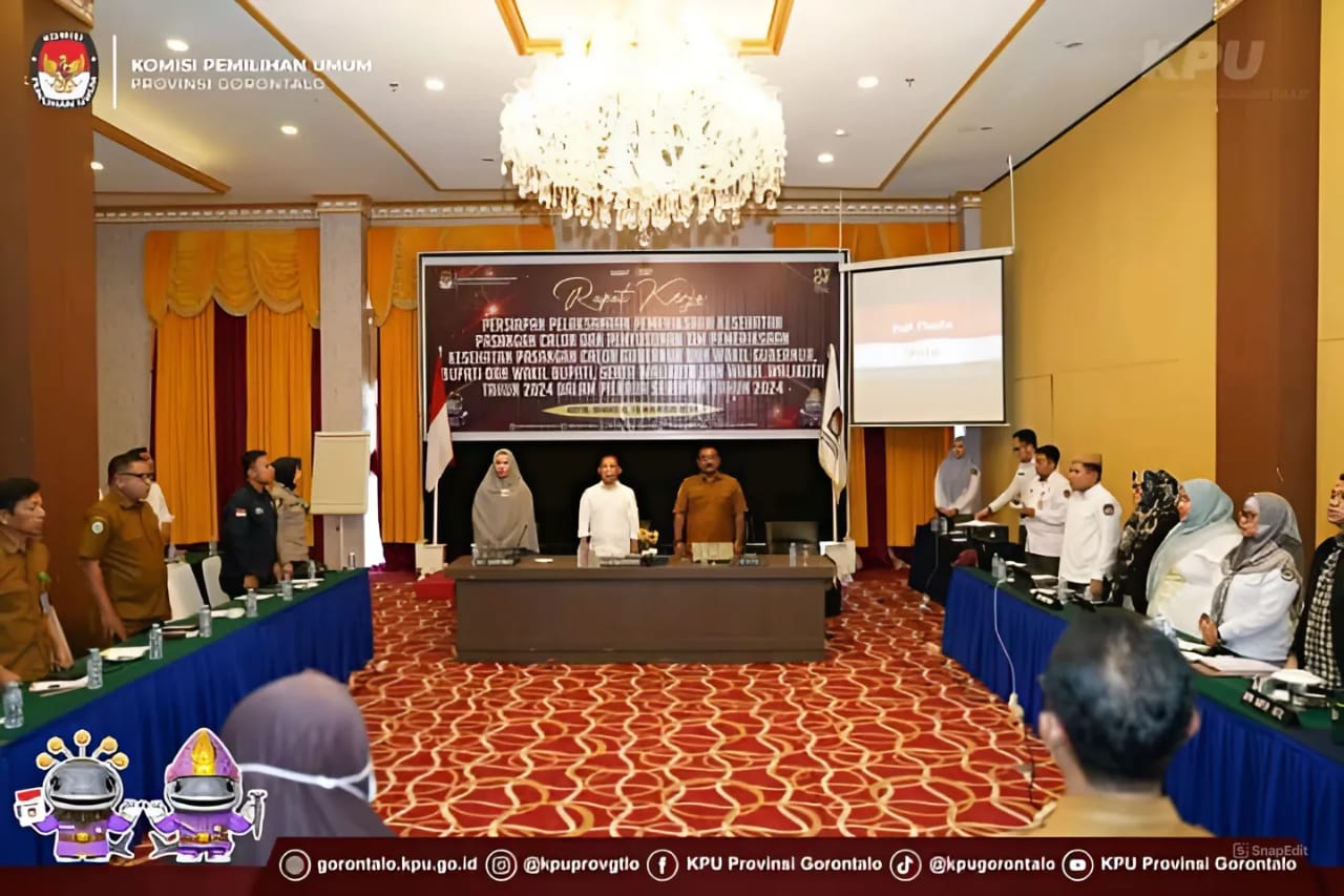 Gorontalo – KPU Provinsi Gorontalo lakukan rapat kerja (raker) dalam rangka mempersiapkan pelaksanaan pemeriksaan kesehatan bagi pasangan calon Gubernur dan Wakil Gubernur, Bupati dan Wakil Bupati, serta Walikota dan Wakil Walikota pada Pilkada Serentak 2024, Rabu (14/08/2024).