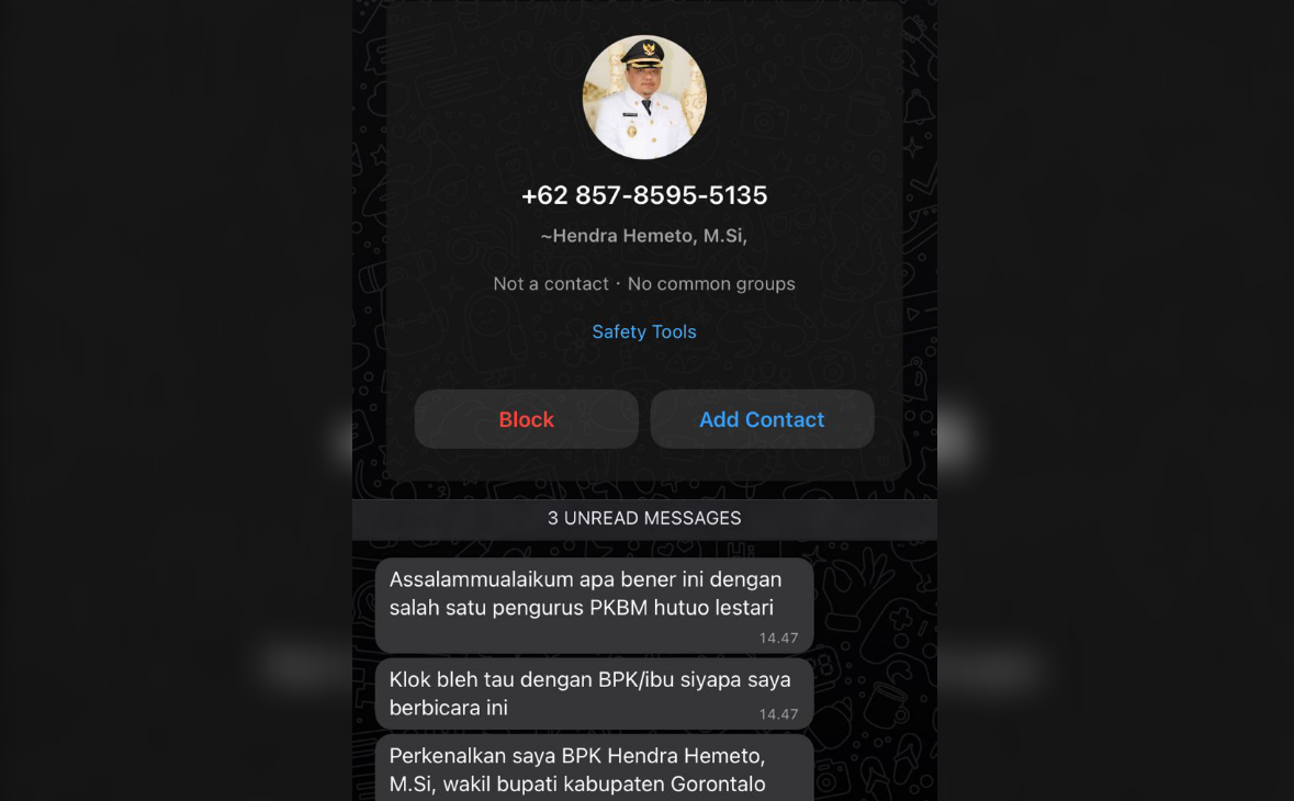 Dalam pesannya, akun tersebut menggunakan foto profil resmi Wakil Bupati Hendra Hemeto yang tengah mengenakan seragam PDH Pemerintah Daerah. Dalam percakapan tersebut, akun mengajukan pertanyaan apakah sedang berkomunikasi dengan salah satu pengurus PKBM Hutuo Lestari dan kemudian memperkenalkan diri sebagai Hendra Hemeto, M.Si, Wakil Bupati Gorontalo.