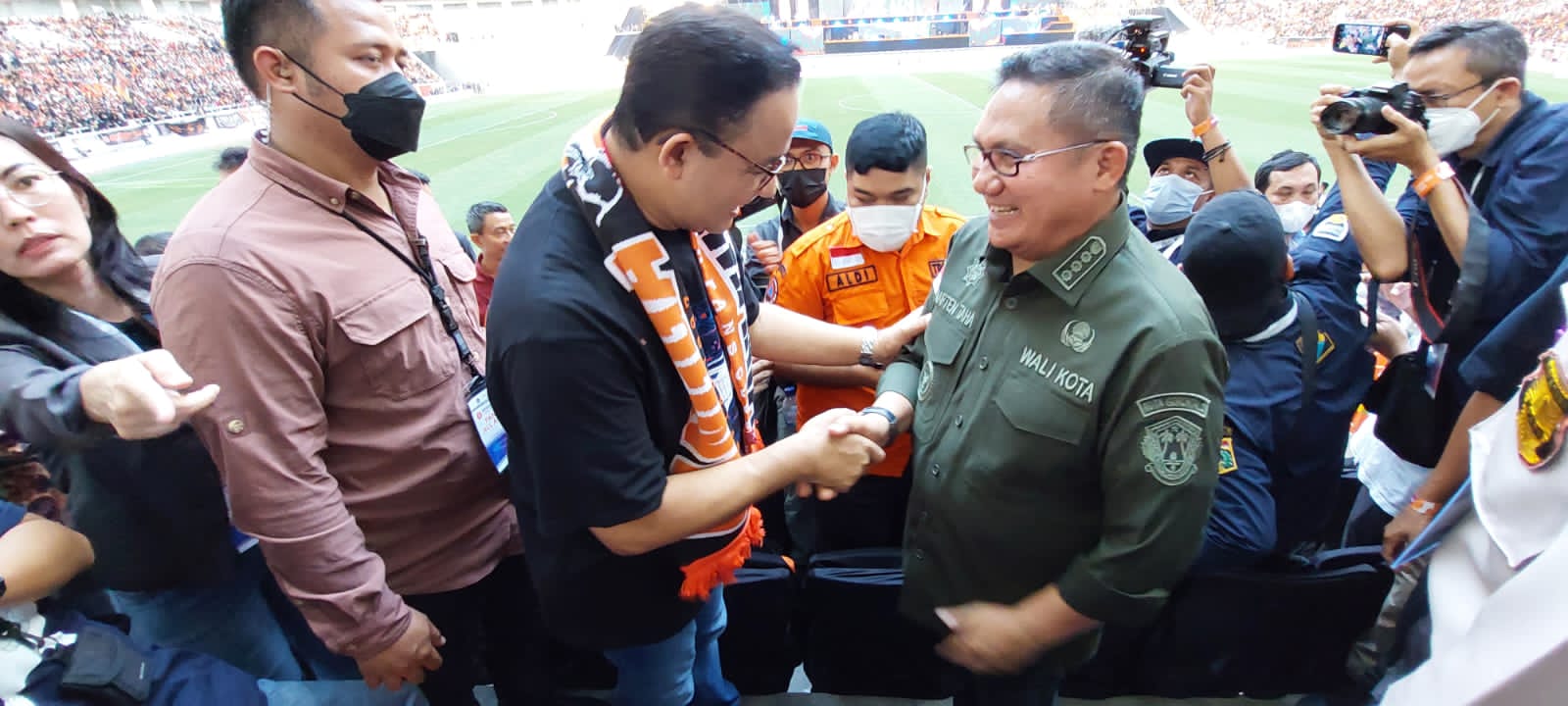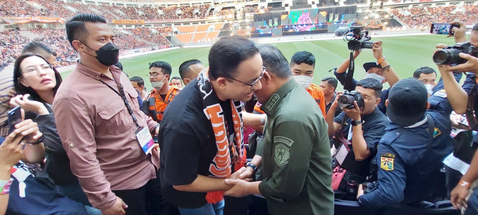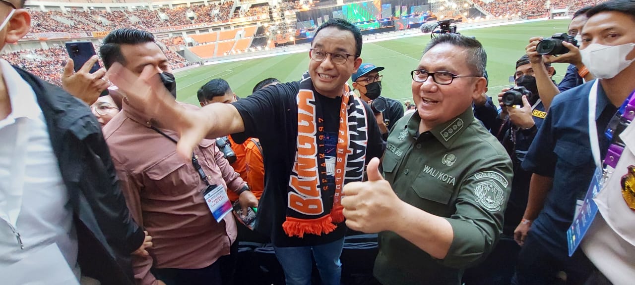 Hal itu terlihat saat Gubernur Anies Baswedan menyambut Wali Kota Marten Taha di tengah pandangan 82.000 penonton yang menghadiri peresmian JIS.