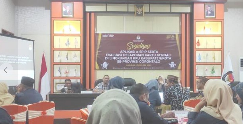 , Limboto – Ketua Komisi Pemilihan Umum (KPU) Kabupaten Gorontalo, Roy Hamrain, bersama Anggota KPU Agustina Bilondatu, Sekretaris KPU Adrian U. Mustapa, Pejabat eselon IV, dan Operator SPIP KPU Kabupaten Gorontalo, menghadiri acara sosialisasi Aplikasi e-SPIP dan evaluasi pelaporan kartu kendali di Kantor KPU Kabupaten Boalemo, Sabtu (9/12/2023).