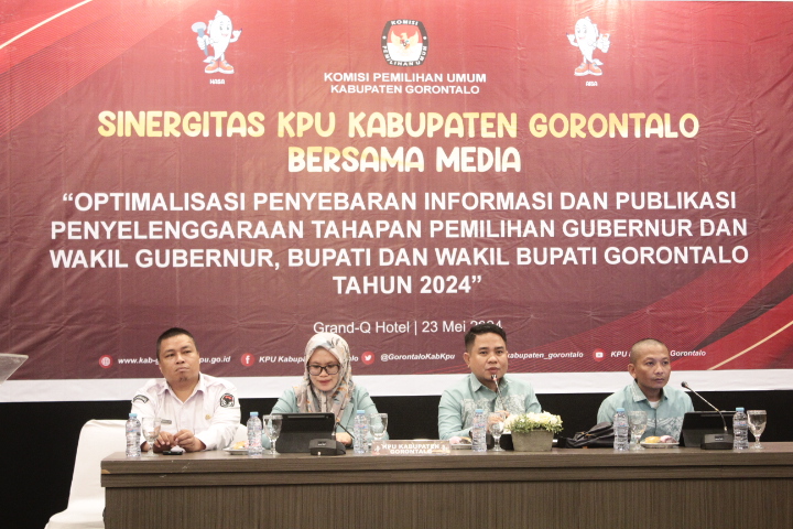 Gorontalo-Komisi Pemilihan Umum (KPU) Kabupaten Gorontalo optimalkan penyebarluasan informasi tahapan pemilihan kepala daerah (Pilkada) serentak 2024 dengan mengadakan pertemuan dengan pimpinan media yang ada di wilayah Provinsi Gorontalo, pada Kamis, (23/05/ 2024).
