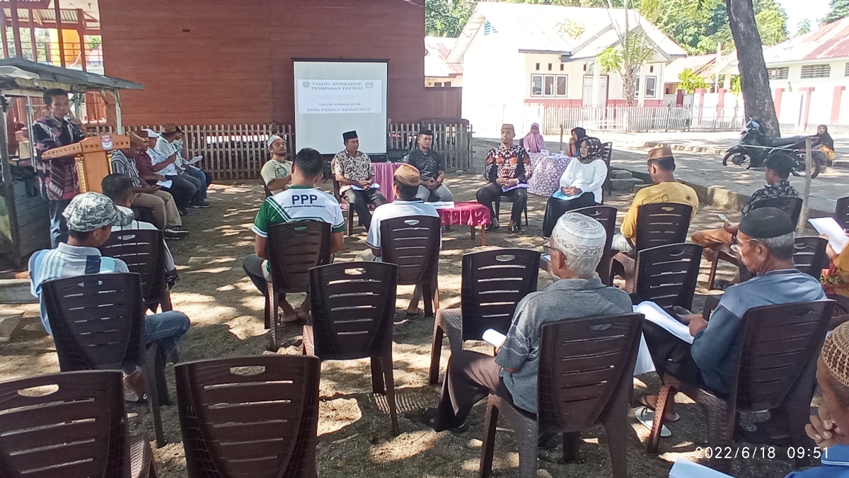 , Gorontalo Utara – Panitia pemilihan Kepala Desa (Pilkades) Desa Ponelo Kecamatan Ponelo Kepulauan (Ponkep), melaksanakan dialog interaktif penyampaian visi dan misi calon kades Ponelo tahun 2022, Sabtu (18/06/2022).