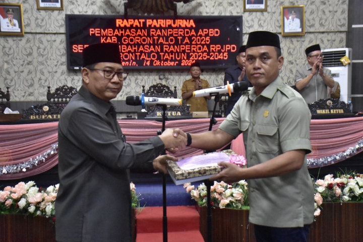 Limboto — Pemerintah Kabupaten (Pemkab) Gorontalo bersama DPRD menggelar rapat paripurna pada Senin (14/10) untuk membahas hal-hal krusial terkait arah pembangunan daerah dalam dua dekade ke depan. Rapat ini berlangsung di ruang sidang DPRD Kabupaten Gorontalo, di mana eksekutif dan legislatif membahas dokumen Anggaran Pendapatan dan Belanja Daerah (APBD) tahun 2025 serta Rencana Pembangunan Jangka Panjang Daerah (RPJPD) 2025-2045.