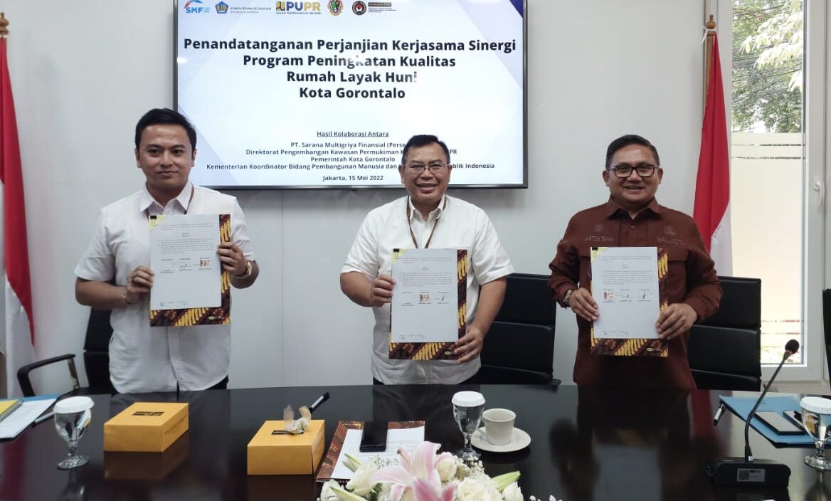 , Jakarta – Wali Kota Gorontalo, Marten Taha, mengumumkan penandatanganan perjanjian kerja sama sinergi program peningkatan kualitas rumah layak huni Kota Gorontalo di Kantor PT. Sarana Muliygriya Finansial (SMF), Jakarta, sebagai bagian dari upaya Pemerintah Kota Gorontalo dalam mengatasi permasalahan kawasan kumuh yang masih menjadi perhatian utama.