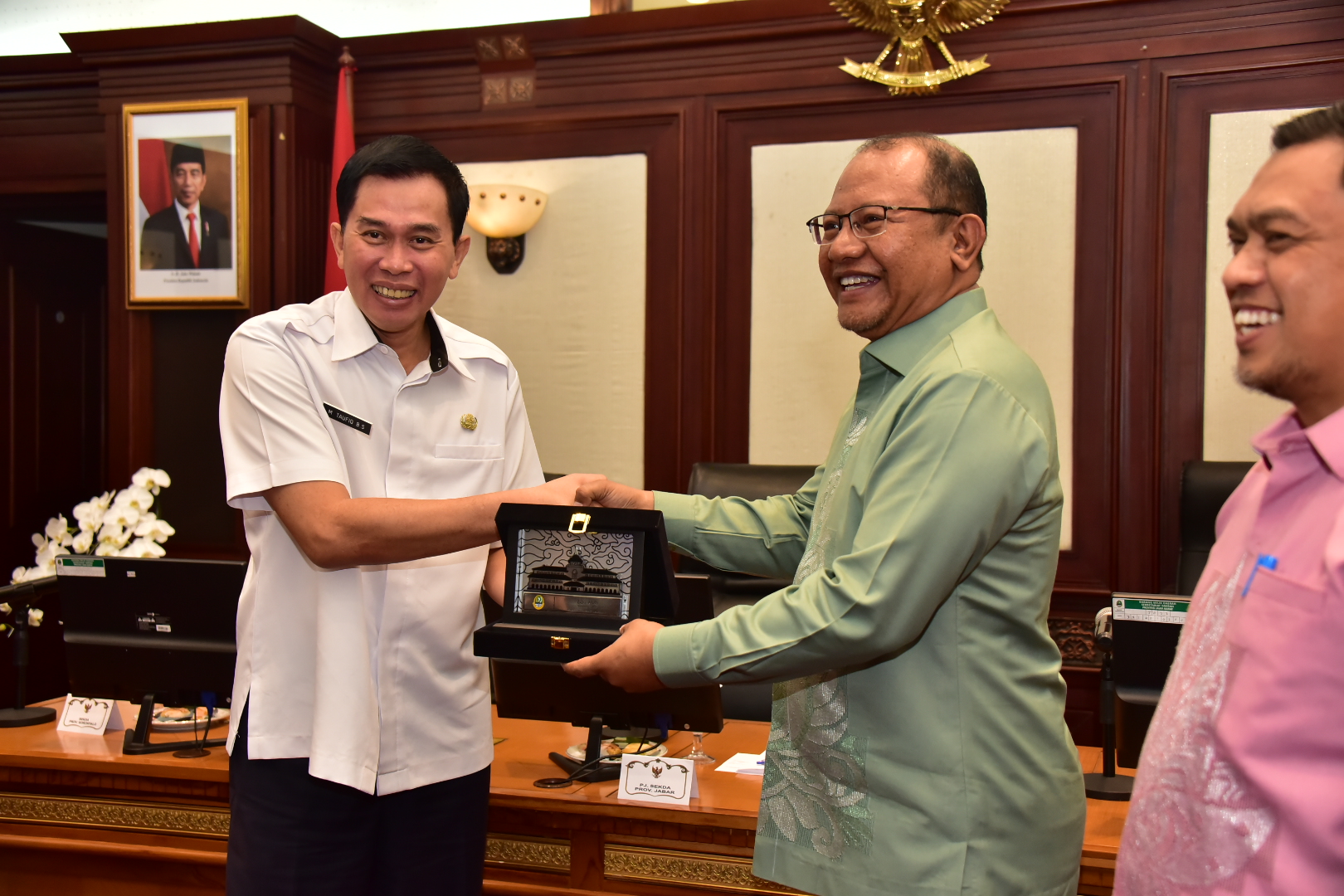 Sekretaris Daerah Provinsi Gorontalo Sofian Ibrahim (kanan) menerima cendera mata dari Penjabat Sekda Jawa Barat Taufik Budi Santoso pada pelaksanaan studi tiru. (Foto: Diskominfotik)