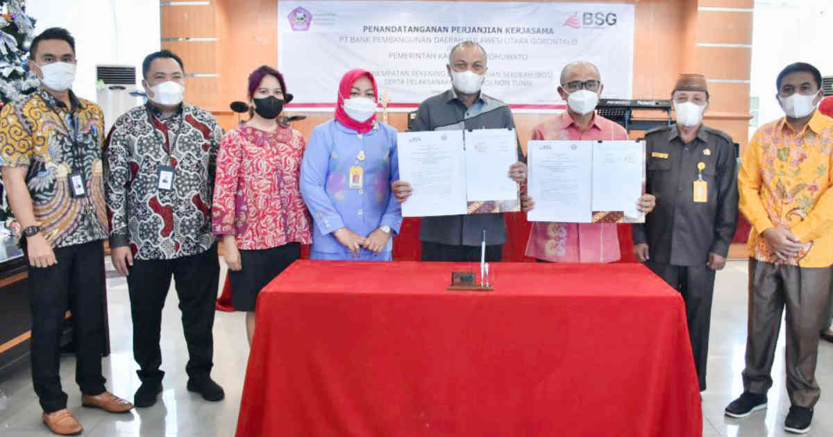 , Pohuwato – Pemerintah Daerah (Pemda) Kabupaten Pohuwato, melalui Bupati Saipul A. Mbuinga, melakukan penandatanganan perjanjian kerja sama untuk penempatan rekening dana Bantuan Oprasional Sekolah (BOS) dan Bantuan Oprasional BOP (BOP) serta pelaksanaan transaksi non tunai bersama PT. Bank Pembangunan Daerah Sulawesi Utara Gorontalo (SulutGo), bertempat di kantor pusat PT. Bank Pembangunan Daerah Sulawesi Utara Gorontalo (SulutGo) Manado, Provinsi Sulawesi Utara (Sulut), Selasa (25/01/2022).