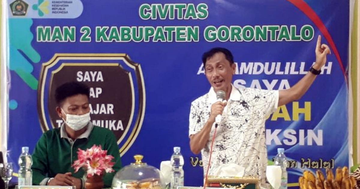 , Kabupaten Gorontalo – Di sela-sela peninjauan proses vaksinasi di di Madrasah Aliyah Negeri (MAN) 2 Tabongo Kabupaten Gorontalo, yang akan mengikuti vaksinasi, Jumat (24/9/2021), Buapti Gorontalo, Nelson Pomalingo memberi arahan kepada para pelaku pendidikan, terutama kalangan pelajar.
