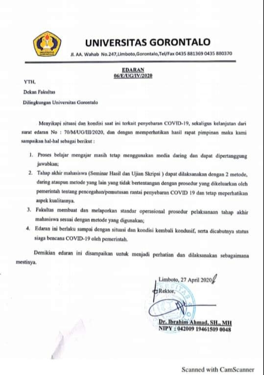 KAMPUS DAILY- Rektor Universitas Gorontalo (UG) Dr. Ibrahim Ahmad, SH, MH, kembali mengeluarkan surat edaran nomor: 06/E/UG/IV/2020 dalam rangka menyikapi situasi dan kondisi saat ini terkait penyebaran Covid-19, sekaligus kelanjutan dari surat edaran nomor : 70/M/UG/3/2020.