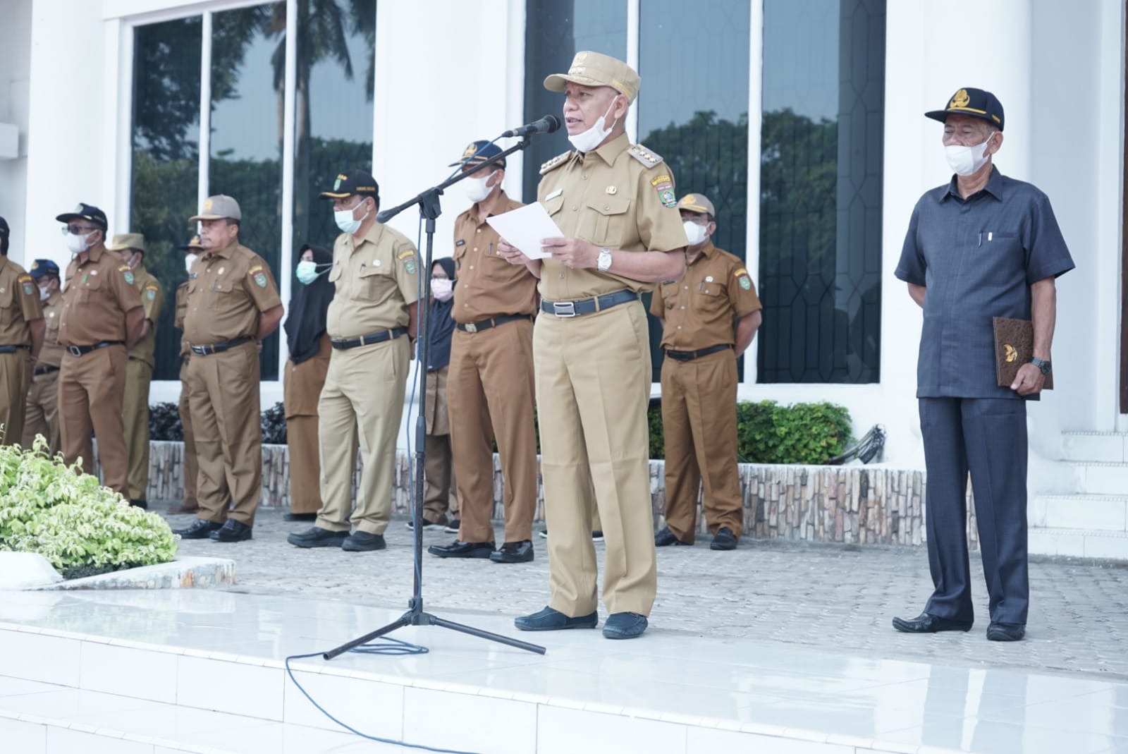 , Asahan – BUPATI Asahan Surya memimpin apel gabungan dilingkungan Pemerintah Kabupaten (Pemkab) Asahan di lapangan, kantor Bupati Asahan, Senin (6/6/2022).