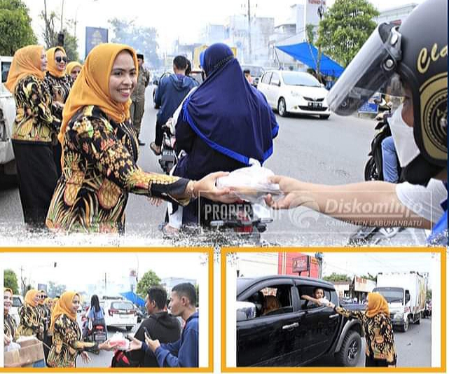 Ketua TP PKK Kabupaten Labuhanbatu Maya Hasmita turun langsung ke jalan untuk membagikan ratusan takjil kepada pengguna jalan yang melintas di simpang Bank Mandiri, Kecamatan Rantau Selatan, Rabu (5/4/2023).