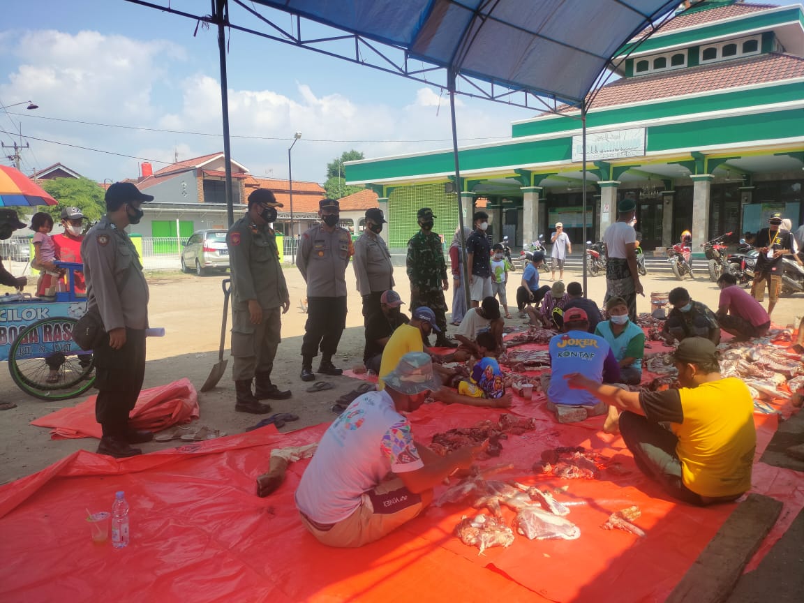 Kapolsek Terisi, IPTU Hendro Ruhanda bersama Kepala Unit Binmas AIPTU Mahfudin beserta anggota personil Polsek, TNI dan Satpol PP, memberikan himbauan kepada pihak Panitia pemotongan hewan Qurban dan DKM Masjid Baiturrohman agar tidak ada kerumunan dan penyaluran hewan Qurban dengan cara door to door atau dibagikan dari rumah ke rumah oleh masing-masing koordinator tiap RT dan RW, sehingga tidak berpotensi terjadinya kerumunan atau antrian panjang.
