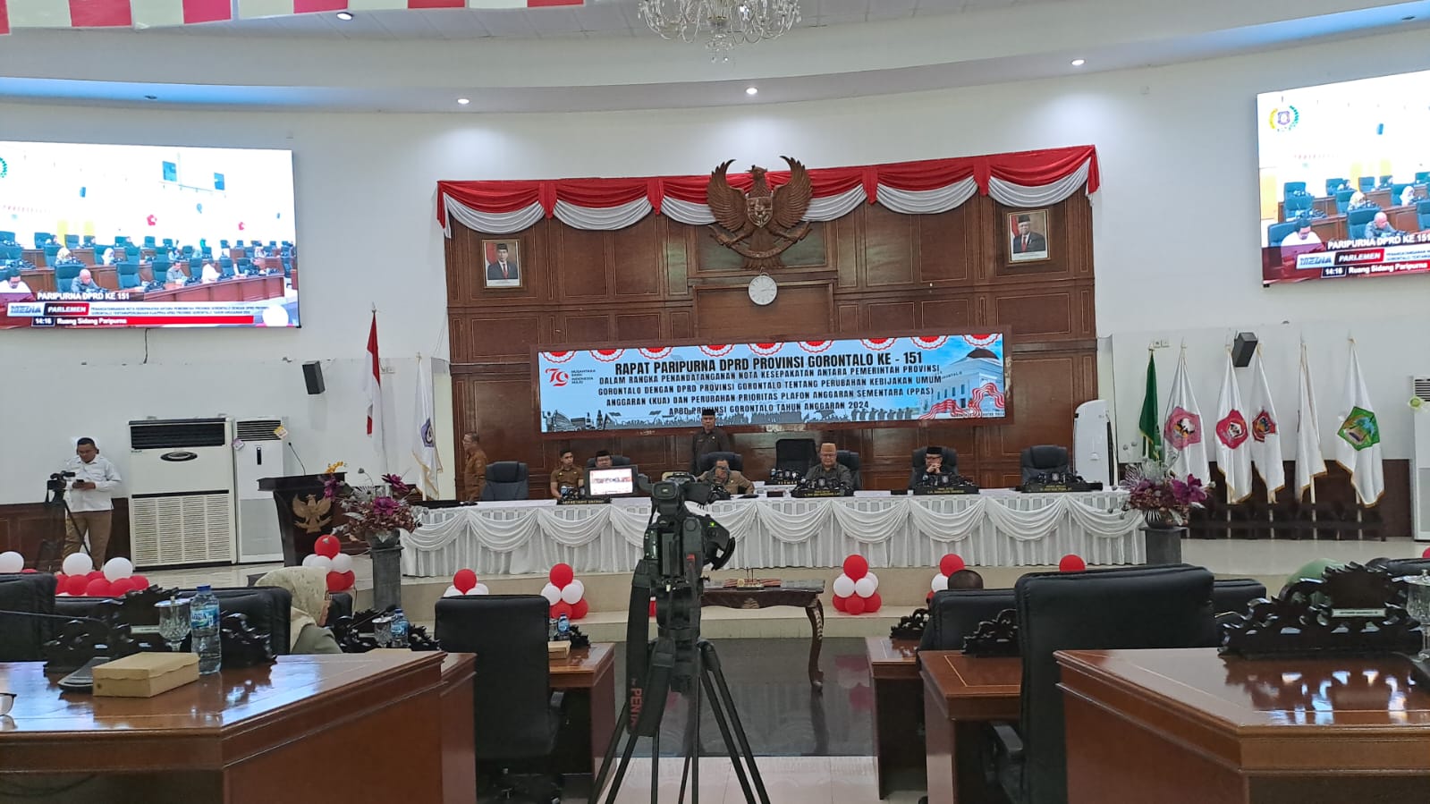 Gorontalo – DPRD Provinsi (Deprov) Gorontalo gelar rapat paripurna ke-151 dalam rangka penandatangan nota kesepakatan antara Pemerintah provinsi (Pemprov) Gorontalo dengan DPRD Provinsi Gorontalo tentang perubahan Kebijakan Umum Anggaran (KUA) dan Perubahan Prioritas Plafon Anggaran Sementara (PPAS) ABPD Provinsi Gorontalo Tahun anggaran 2024, Senin (12/08/2024).