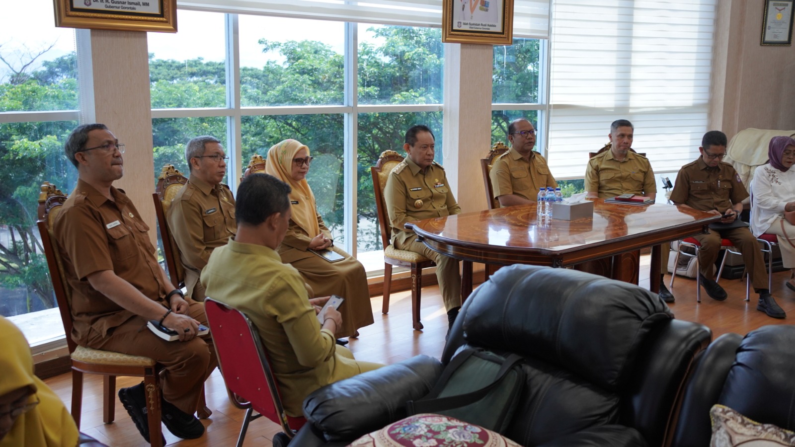 Gubernur Gorontalo Gusnar Ismail saat melaksanakan rapat bersama Sekretaris Daerah Provinsi (Sekdaprov) Sofian Ibrahim dan sejumlah pimpinan OPD yang berlangsung di ruang kerjanya, Senin (21/4/2025). Foto (Diskominfotik)