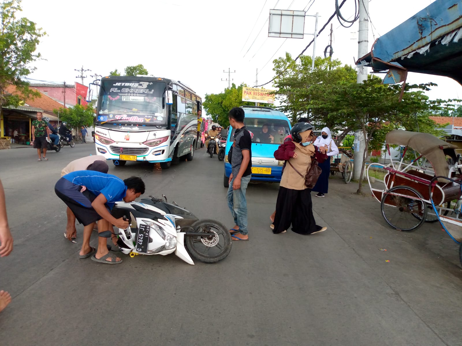 , Pemalang – Sebuah Sepeda Motor yang di kendarai oleh Eviyanti (45) Seorang Guru smp nyaris menjadi korban laka lantas kejadian pada pukul 15.00 WIB, sempat membuat histeris, warga yang melihat kejadian tersebut.