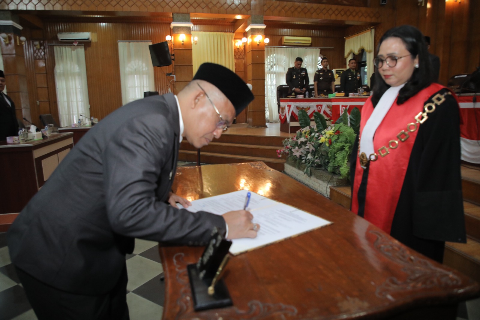Terlihat Ketua PN Kisaran Halida Rahardhini, SH, M. Hum mengambil sumpah/janji Thomy Faisal, SH, MH sebagai PAW Anggota DPRD Kabupaten Asahan Sisa Masa Jabatan 2019-2024. Dilanjutkan dengan penyematan Lencana Anggota DPRD Kabupaten Asahan disaksikan Sekretaris Daerah Kabupaten Asahan, Ketua DPRD Kabupaten Asahan, mewakili Dandim Asahan 0208/Asahan, mewakili Danlanal TBA, mewakili Danyon 126/KC, mewakili Kapolres Asahan, mewakili Kajari Asahan Anggota DPRD Kabupaten Asahan, OPD dan tamu undangan lainnya.