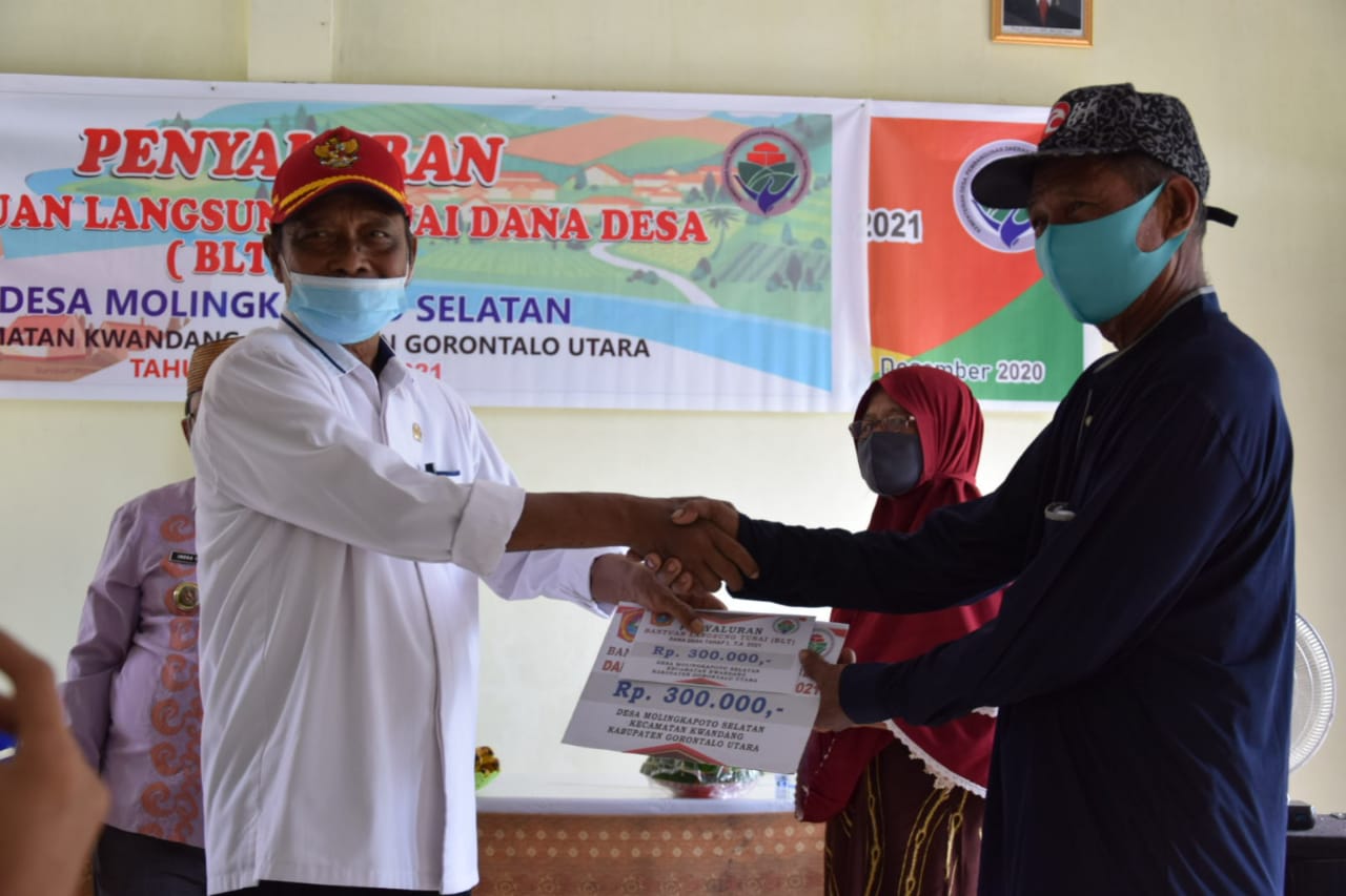 , Gorut– Ketua Dewan Perwakilan Rakyat Daerah (DPRD) Kabupaten Gorontalo Utara (Gorut), Djafar Ismail secara resmi menyerahkan Bantuan Langsung Tunai (BLT) Dana Desa (DD) di Desa Molingkapoto Selatan, Kecamatan Kwandang, Kamis (21/1/2021).