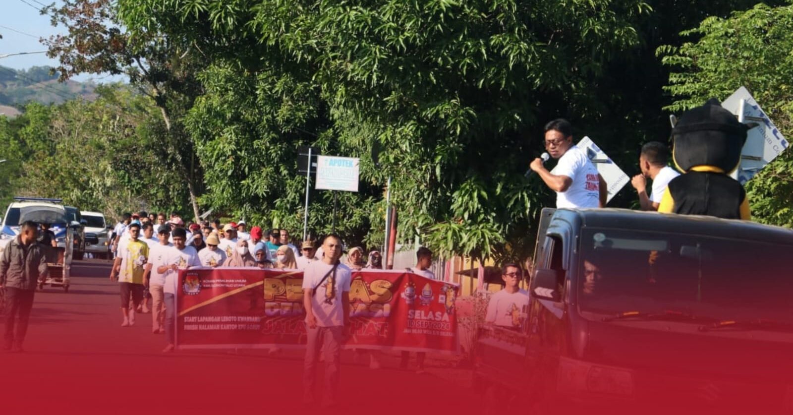 Gorontalo Utara — KPU Kabupaten Gorontalo Utara menyelenggarakan acara Pentas Demokrasi pada Selasa (10/09/2024), sebagai upaya untuk meningkatkan partisipasi masyarakat dalam Pemilihan Bupati dan Wakil Bupati Gorontalo Utara pada November mendatang. Acara ini dimulai dengan kegiatan jalan sehat dari Desa Leboto menuju Kantor KPU Gorontalo Utara, yang kemudian diikuti dengan berbagai aktivitas menarik dan edukatif lainnya.