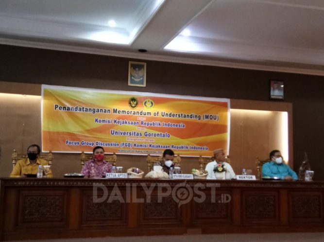 – Komisi Kejaksaan Republik Indonesia bersama Universitas Gorontalo (UG) menggelar Focus Group Discussion (FGD) Komisi Kejaksaan Republik Indonesia yang dirangkaikan dengan penandatangan MoU, terkait “Penguatan Kapasitas Masing-Masing Lembaga, di Auditorium Kampus UG, Kamis (19/11/2020).