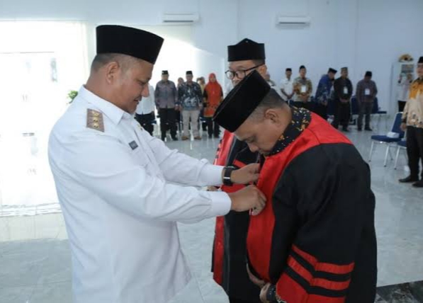 Prosesi pelantikan ditandai dengan pemasangan jubah secara simbolis kepada perwakilan Dewan Juri oleh Wakil Bupati Asahan.
