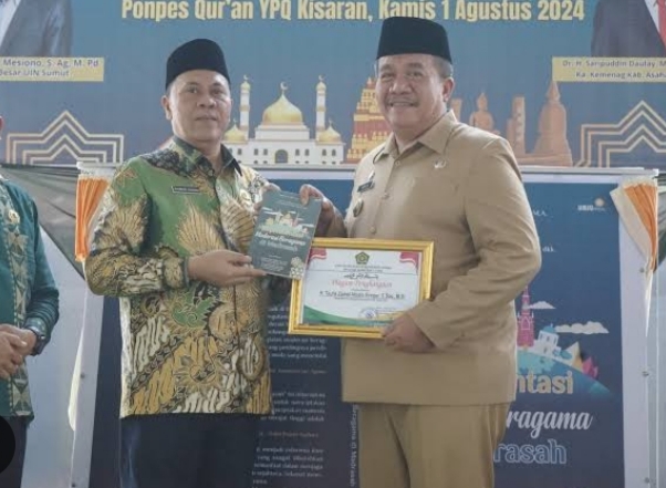 Asahan – Wakil Bupati Asahan, Taufik Zainal Abidin S. Sos, M. Si menghadiri launching buku dan penguatan implementasi moderasi beragama kepala dan guru Madrasah Se-Kabupaten Asahan yang di laksanakan di aula Ponpes Qur’an YPQ Kisaran Kamis, (01/082024). Launching buku ini juga dikemas dengan pemberian buku dan penghargaan sertifikat sebagai tokoh moderasi beragama se Sumatera kepada Wakil Bupati Asahan yang di serahkan langsung oleh Kepala Kantor Wilayah Kementerian Agama Provinsi Sumatera Utara, H. Ahmad Qosbi, S.Ag, MM.