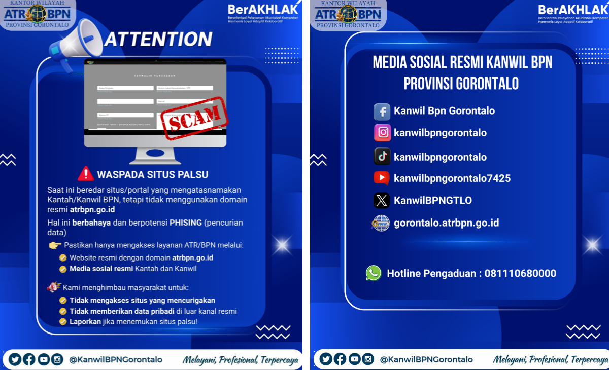 Kanwil BPN Gorontalo meminta masyarakat untuk tidak sembarangan mengakses portal layanan dan memastikan hanya menggunakan situs resmi dengan domain .atrbpn.go.id serta media sosial resmi Kanwil atau Kantah ATR/BPN.