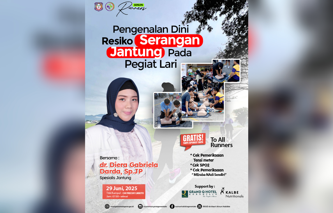 Kegiatan ini merupakan kolaborasi antara RS Ainun Runners, RSUD dr. Hasri Ainun Habibie, serta didukung oleh Grand Q Hotel Gorontalo dan Kalbe Nutritionals, yang memiliki kepedulian tinggi terhadap gaya hidup sehat dan pencegahan penyakit jantung di kalangan masyarakat.